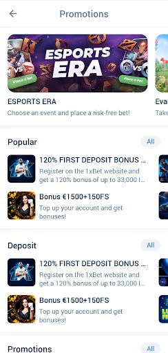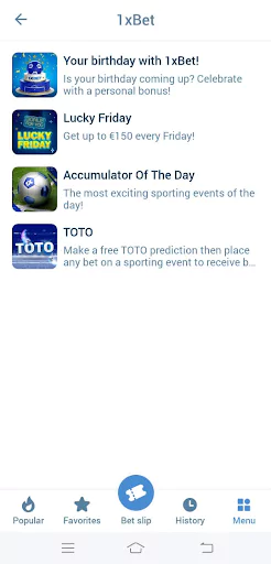 1xBet mobil uygulamasındaki Promosyonlar bölümüne giderek sizin için uygun olan en son bonuslar ve promosyonlar hakkında bilgi edinebilirsiniz.