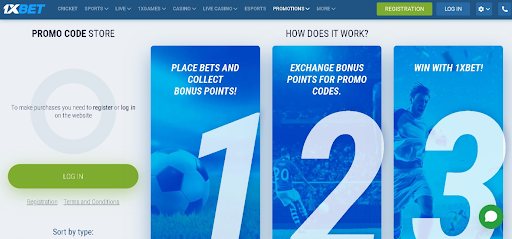 Promosyon kodu yok. Ancak, 1xBet’in bir promosyon kodu mağazası var. İlk olarak, bahis yaparak bonus puanları toplarsınız. Ardından, bu bonus puanları promosyon kodları ile takas edersiniz. E-sporlarda, oyunlarda, sporlarda ve bahislerde bonus puan kazanabilirsiniz.